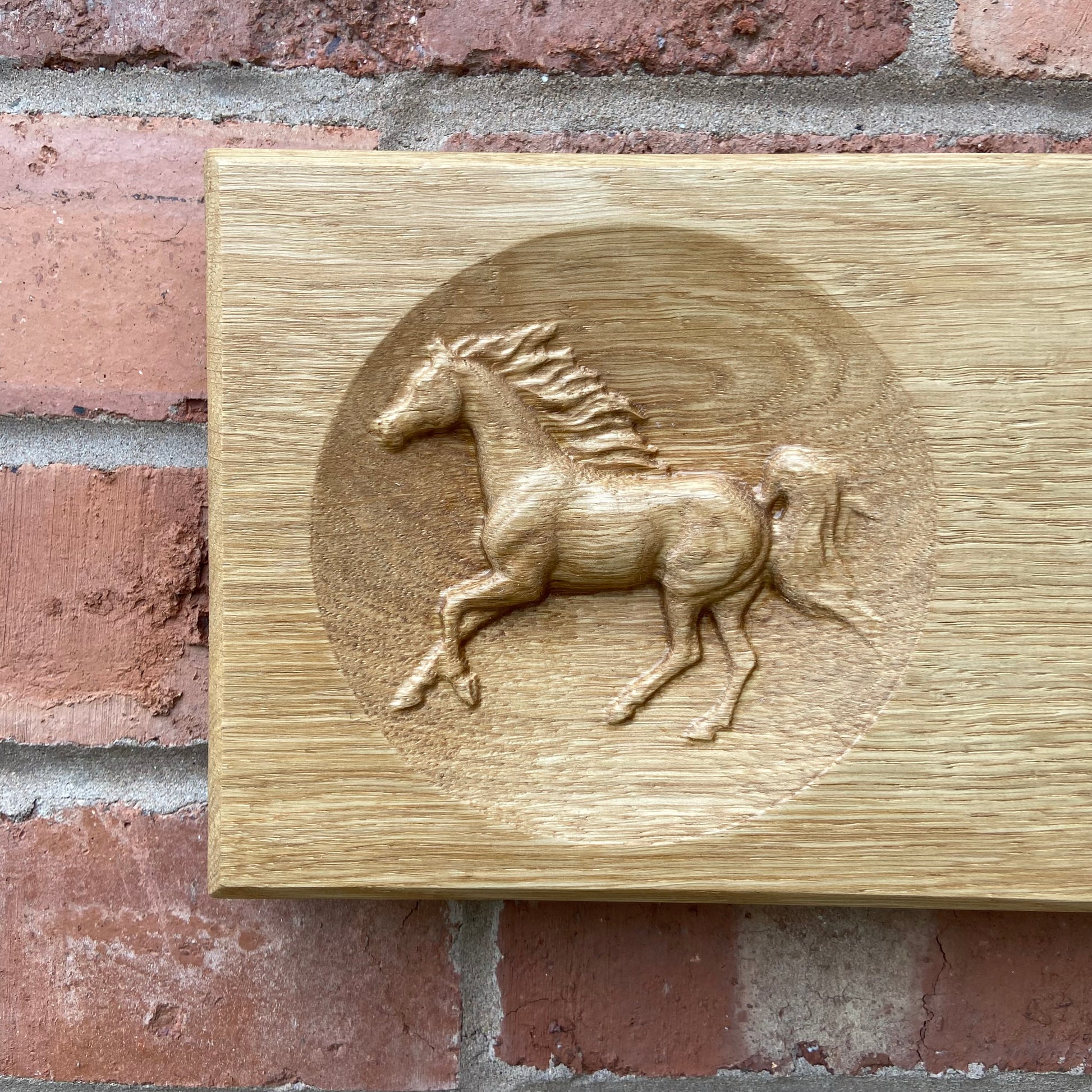 Personalised with deep carved engraving. Available plain, or with carved image of a cantering horse.