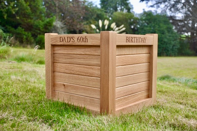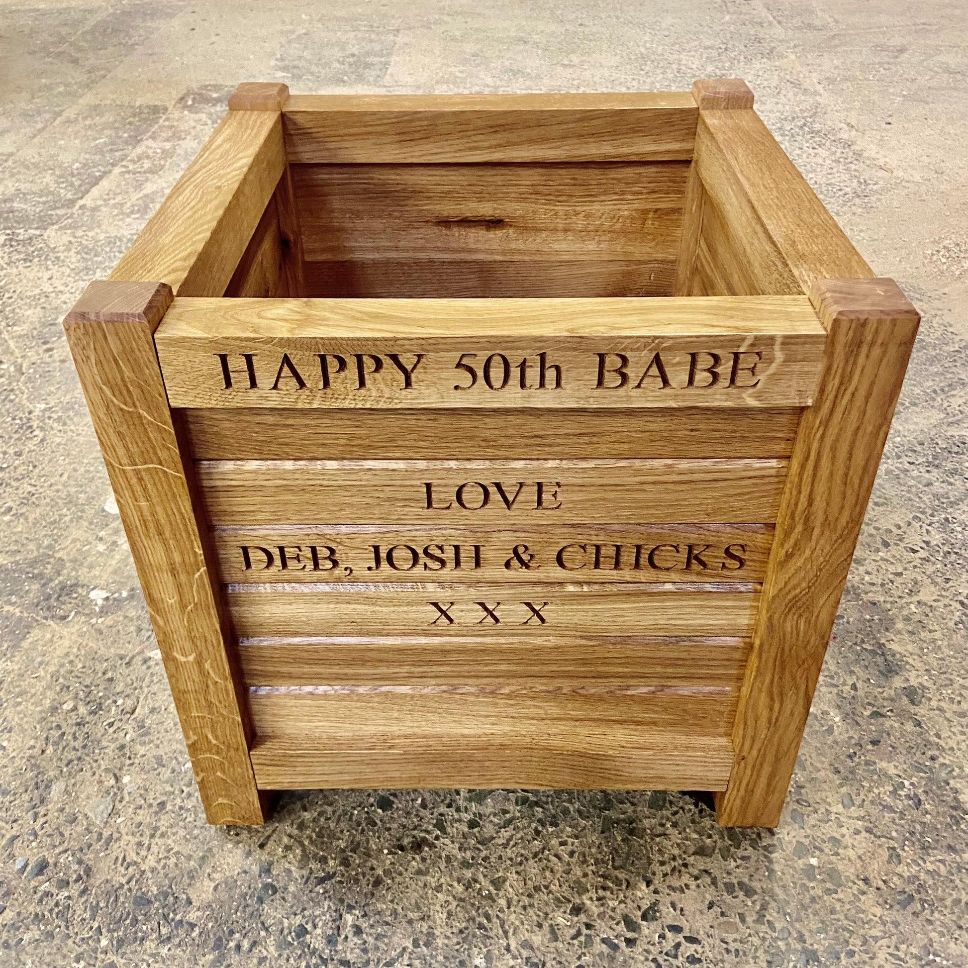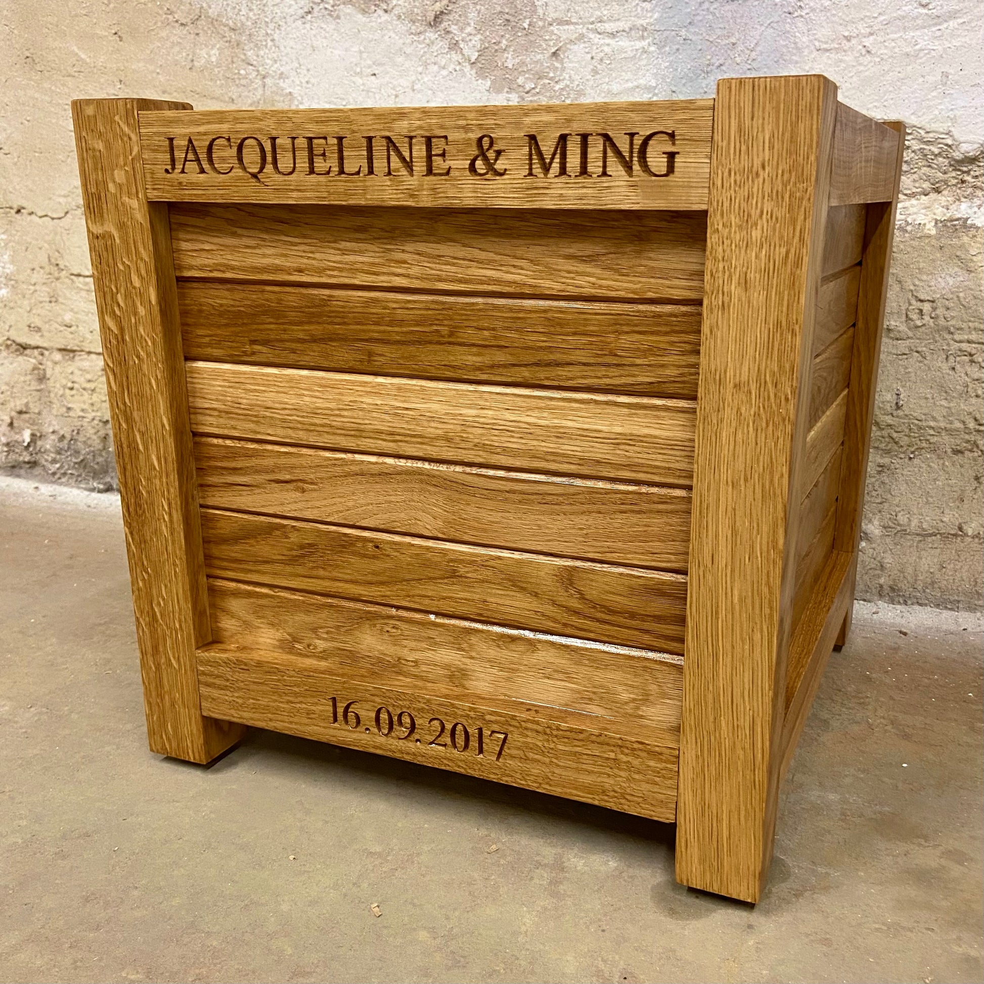 Supplied unfinished, our planters will weather beautifully and silver over time. We can also treat with teak oil to  protect the wood if required. Please note that oil will darken the oak slightly from the colour in the photographs.