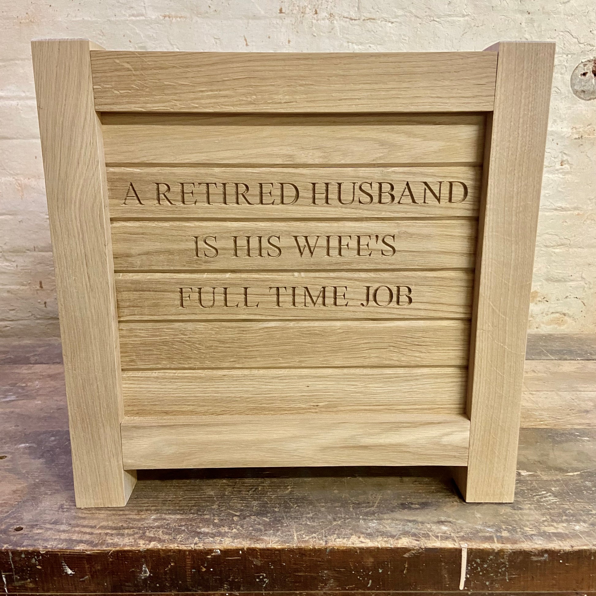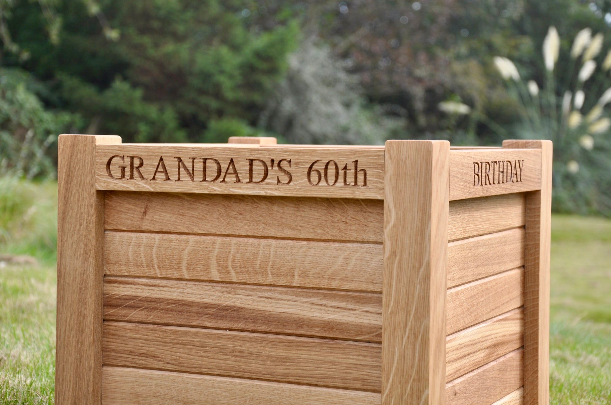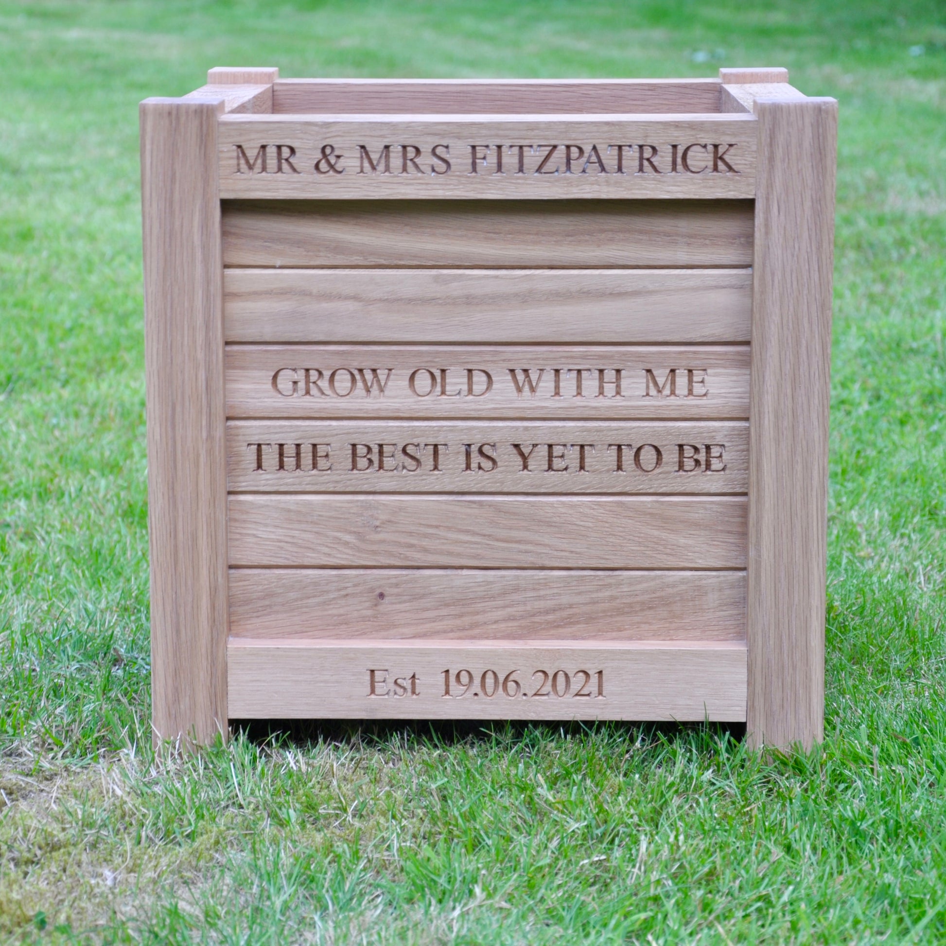 Supplied unfinished, our planters will weather beautifully and silver over time. We can also treat with teak oil to  protect the wood if required. Please note that oil will darken the oak slightly from the colour in the photographs.